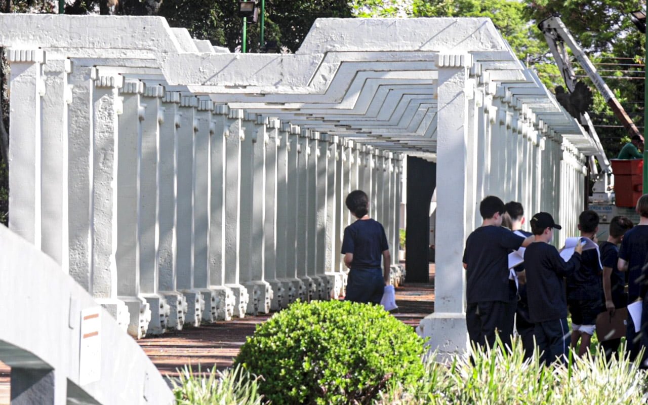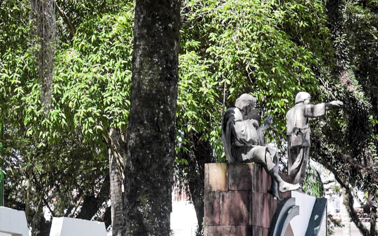 A Praça Pinheiro Machado une duas nações, a nação missioneira e a nação de colonos imigrantes vindos da Europa. Pois antes de ser a praça urbana como conhecemos, já era um espaço em que se realizavam atividades coletivas na redução de Santo Ângelo Custódio, conhecido como o último dos Sete Povos das Missões, fundado pelo padre espanhol Diogo Hasse. Então, a praça, sempre foi a praça. Serviu, e, ainda serve, para a convivência coletiva dos moradores. Por este motivo, vamos encontrar nela, elementos que simbolizam duas histórias de ocupação de território, distintas. A primeira delas lembra os povos indígenas que se integraram com padres espanhóis e constituíram uma nova cultura na Terra, a outra, o período de colonização, quando imigrantes europeus começaram a vir para o interior do Rio Grande do Sul, formando as cidades no modelo atual e do jeito que conhecemos atualmente.