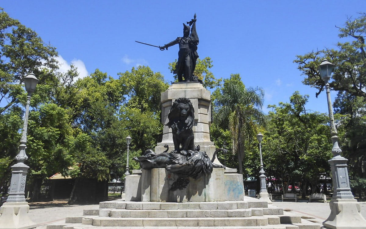 A praça é adornada por diversos monumentos significativos, incluindo o monumento-túmulo em homenagem ao General Bento Gonçalves. Inaugurado em 1909, este monumento abriga os restos mortais do General e é repleto de simbolismo. Representando o Brasil e o Rio Grande do Sul, dois leões adornam o monumento. Enquanto o leão superior simboliza o Brasil em uma posição vitoriosa, o leão inferior representa o Rio Grande do Sul, pronto para reagir, refletindo o espírito farroupilha que vive no coração dos gaúchos. Além disso, a praça abriga uma série de outros monumentos, como o coreto, o chafariz dos anjinhos, o monumento ao Irmão Isício, uma homenagem à Imprensa, uma imagem de Jesus no lago, a estátua em ferro “Vênus ao banho”, a herma ao Almirante Tamandaré, a herma ao Professor Luis Franca Pinto, entre outros.
